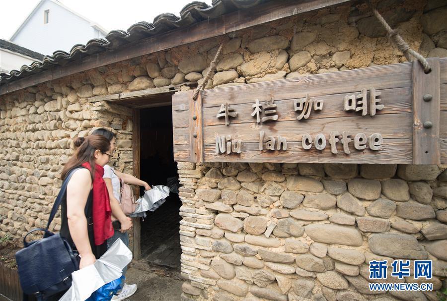 游客走進浙江省桐廬縣江南鎮(zhèn)荻浦村由牛欄改建的咖啡館(2018年4月23日攝)。新華社記者 翁忻旸 攝