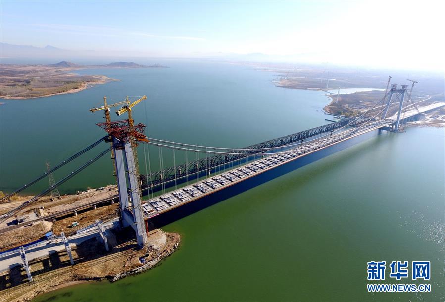 當(dāng)日,河北省懷來縣官廳水庫公路大橋主橋成功合龍。據(jù)介紹,該橋采用雙向四車道城市主干路標(biāo)準(zhǔn)建設(shè),設(shè)計(jì)為雙塔單跨懸索橋,全長1988米, 橋主塔高107.8米,橋?qū)?3.6米,主橋720米一跨過湖。