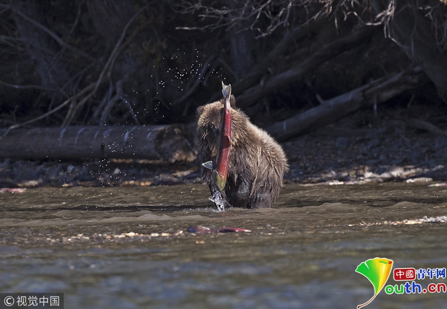 鮭魚(yú)看起來(lái)比小棕熊還“大”。