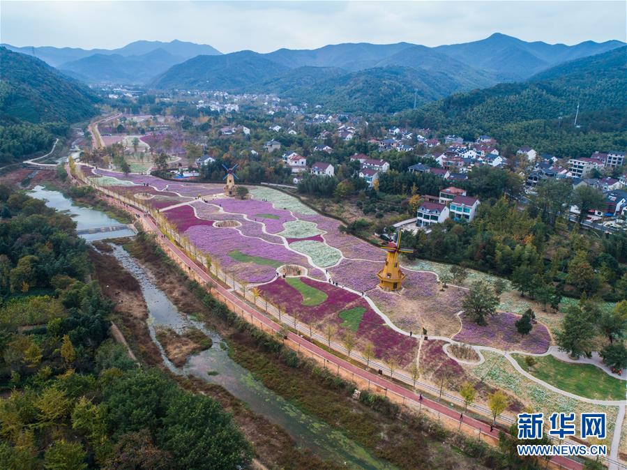 11月2日,空中俯瞰小浦鎮(zhèn)的“五彩花?!?,多彩的花海與金黃的銀杏林構(gòu)成了一幅美麗的秋季風(fēng)景(無人機(jī)拍攝)。 新華社記者 徐昱 攝