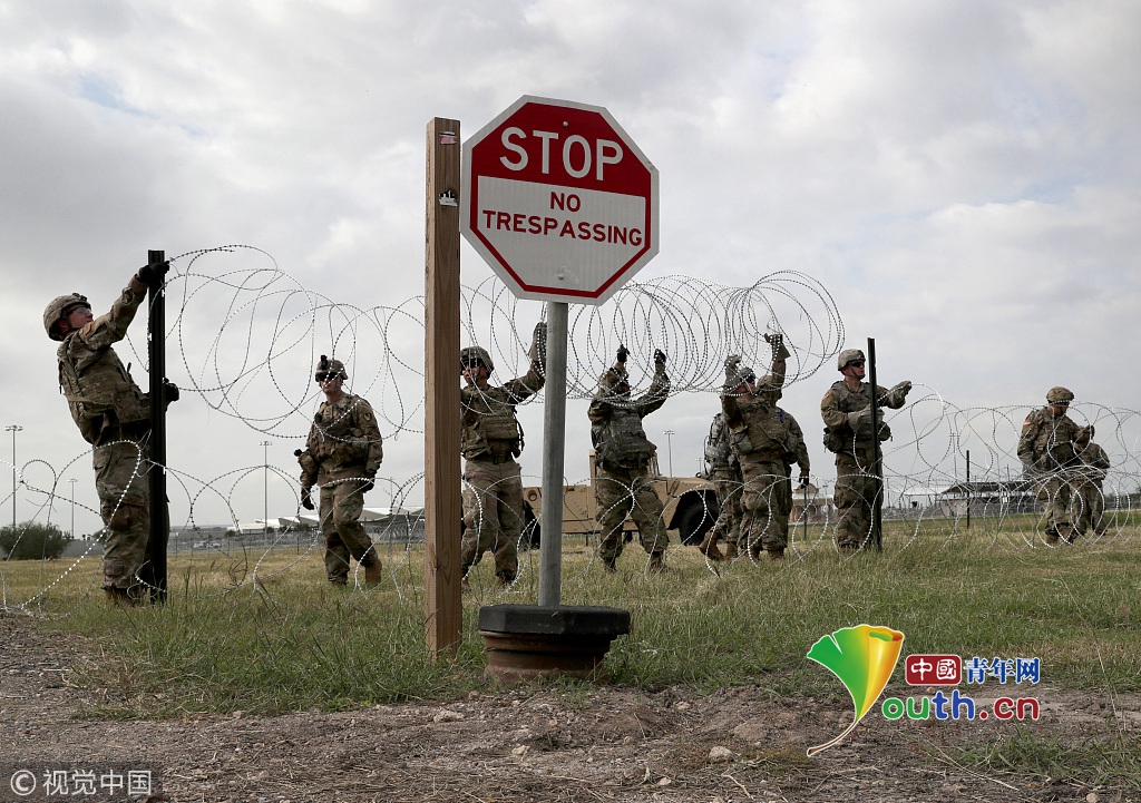 美國(guó)士兵部署美墨邊境點(diǎn),鋪設(shè)鐵絲網(wǎng)應(yīng)對(duì)移民大軍壓境。