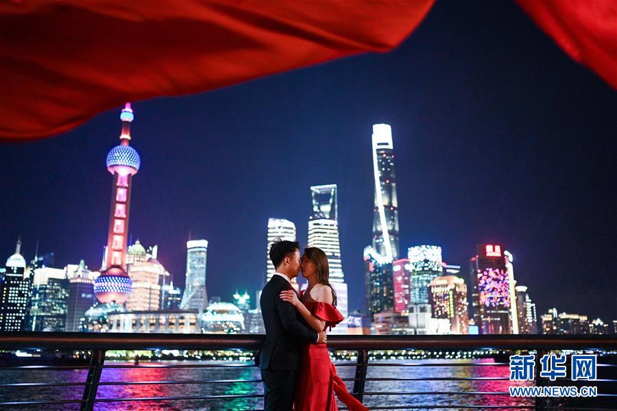 11月1日,一對青年男女在上海外灘拍攝婚紗照。首屆中國國際進口博覽會即將在上海開幕。美麗的上海張開懷抱,迎接八方來客。 新華社記者 陳曄華 攝