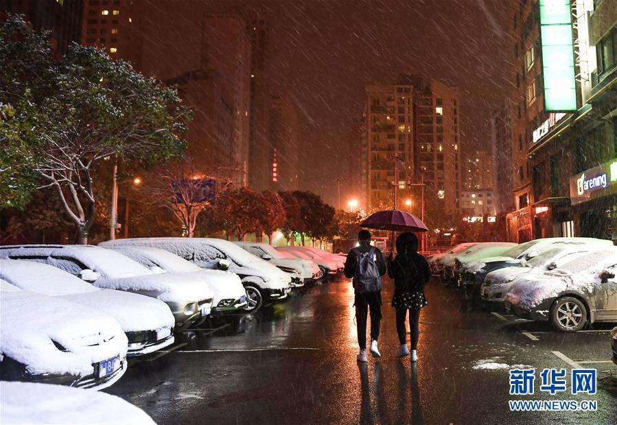 在青海省西寧市,兩名市民冒雪前行(11月3日攝)。 11月3日,青海省西寧市等地迎來(lái)降雪。 新華社記者 吳剛 攝