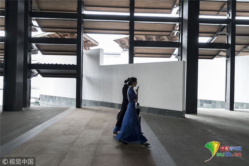 2016年11月16日,浙江烏鎮(zhèn),第三屆世界互聯(lián)網(wǎng)大會首日,身著群青鸞鳳刺繡旗袍的大學生禮儀賣萌自拍,成為會議間隙的一道風景。