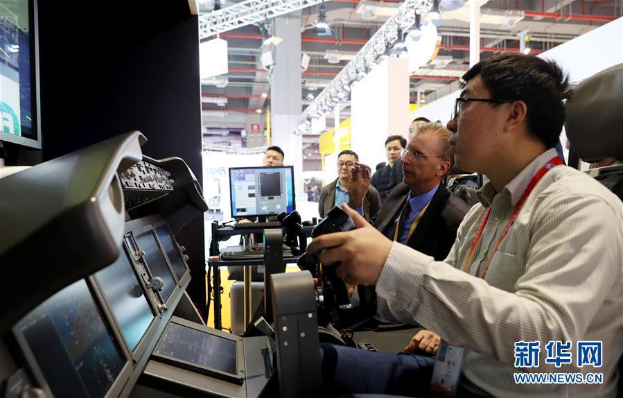 11月5日,一名參觀者在美國波音公司展臺(tái)體驗(yàn)787機(jī)型的模擬駕駛艙。 新華社記者 方喆 攝