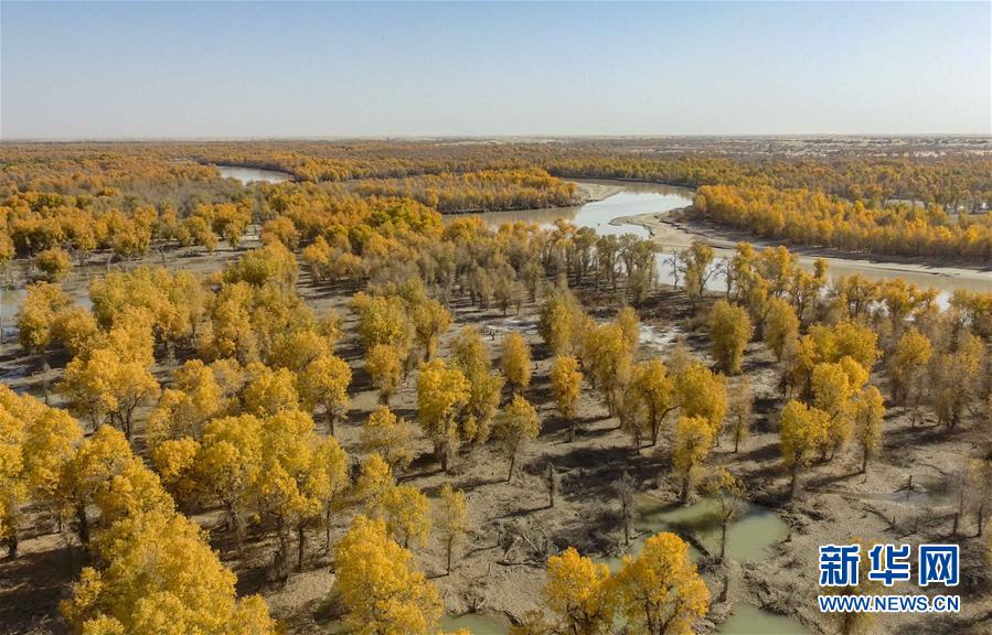 這是從空中俯瞰新疆巴音郭楞蒙古自治州尉犁縣的金色胡楊(10月25日無人機(jī)拍攝)。 新華社記者 趙戈 攝