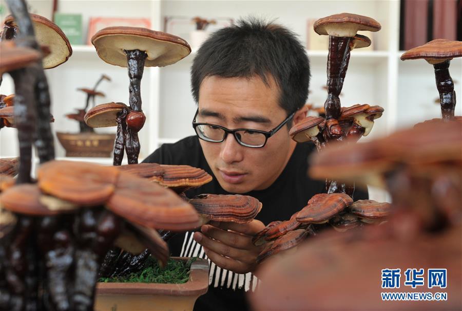 6月20日,廣宗縣大柏社村村民王志恒在展示制作的靈芝盆景。 近年來,河北省廣宗縣大柏社村積極引導(dǎo)農(nóng)民結(jié)合市場需求調(diào)整農(nóng)業(yè)產(chǎn)業(yè)結(jié)構(gòu),采取“公司+合作社+基地+農(nóng)戶”的經(jīng)營模式,發(fā)展特色靈芝種植,并開發(fā)出靈芝盆景、靈芝孢子粉等相關(guān)衍生產(chǎn)品,開辟出一條富農(nóng)創(chuàng)收新路徑。目前,大柏社村靈芝種植面積近百畝,種植各類靈芝5000余株,帶動120余名農(nóng)民就業(yè)增收。新華社記者朱旭東攝