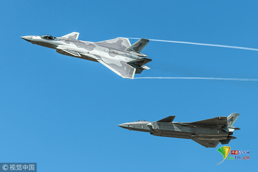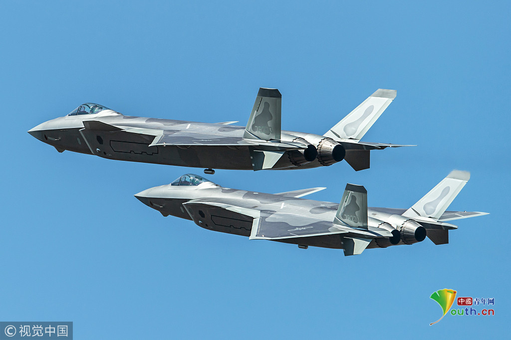 圖二:2018年11月6日,廣東珠海航展上,兩架殲-20戰(zhàn)機(jī)組成雙機(jī)編隊進(jìn)行飛行表演。