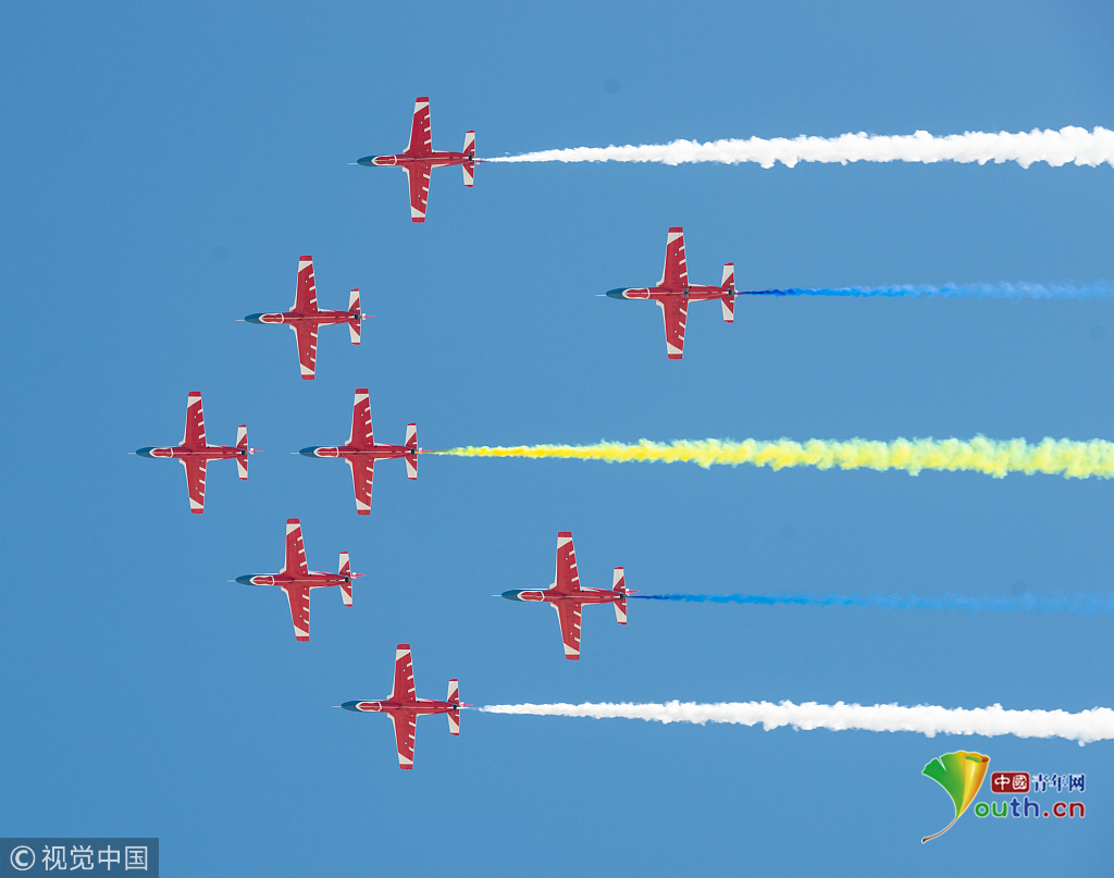 2018年11月8日,廣東珠海,第十二屆中國國際航展第三天??哲姟鞍艘弧憋w行表演隊的隊員們,發(fā)揚連續(xù)作戰(zhàn)精神,給觀眾們表演了七機(jī)分組開花、四機(jī)編隊橫滾等高難動作,受到觀眾們的稱贊。視覺中國