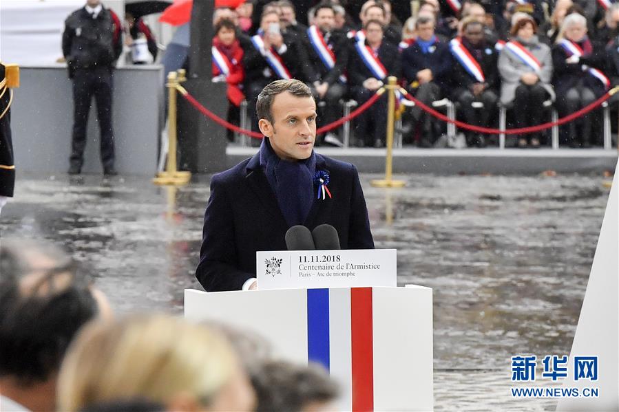 11月11日,在法國(guó)巴黎,法國(guó)總統(tǒng)馬克龍?jiān)诩o(jì)念儀式上致辭。當(dāng)日,法國(guó)政府在巴黎凱旋門前舉行儀式,隆重紀(jì)念第一次世界大戰(zhàn)結(jié)束一百周年。新華社記者 陳益宸 攝