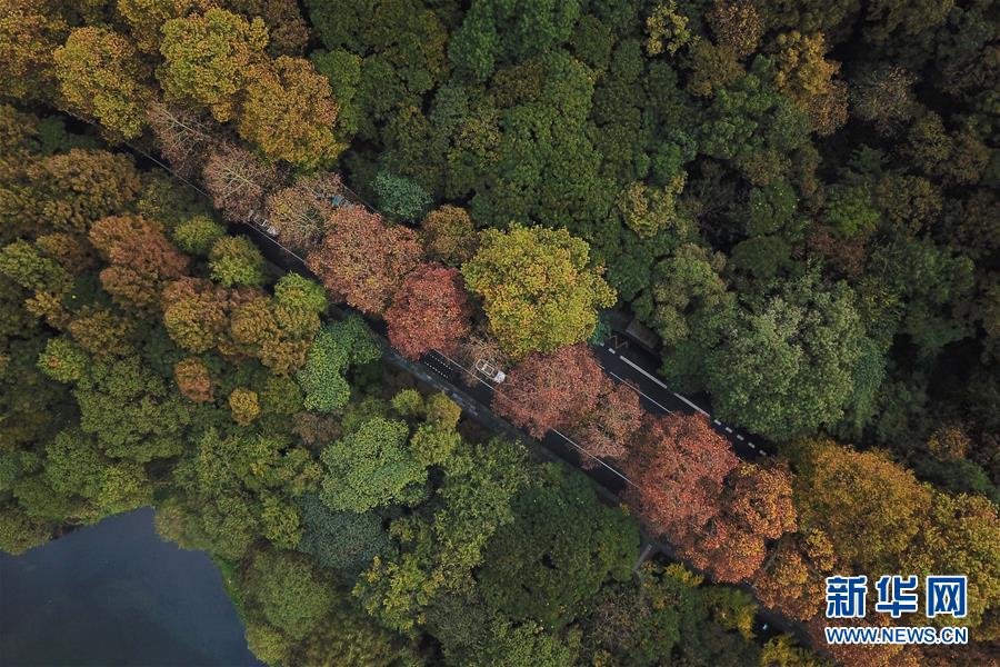 11月13日無人機拍攝的杭州西湖一景。 時值初冬,杭州市西湖景區(qū)層林盡染,色彩斑斕,別有一番韻味。