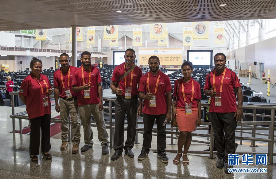 11月13日,幾名工作人員在巴布亞新幾內(nèi)亞首都莫爾茲比港的APEC國際媒體中心內(nèi)合影。 新華社記者白雪飛攝