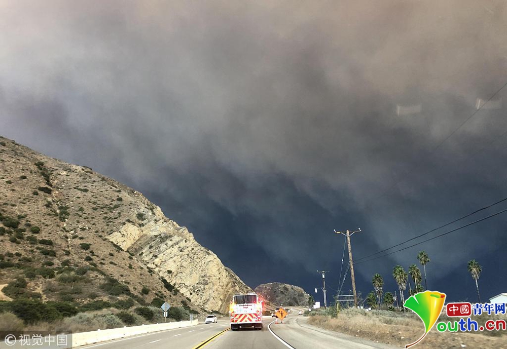 當(dāng)?shù)貢r間11月9日下午,美國加利福尼亞州南部文圖拉郡(Ventura County)等地熊熊山火已延燒逾萬英畝,濃煙遮天蔽日。