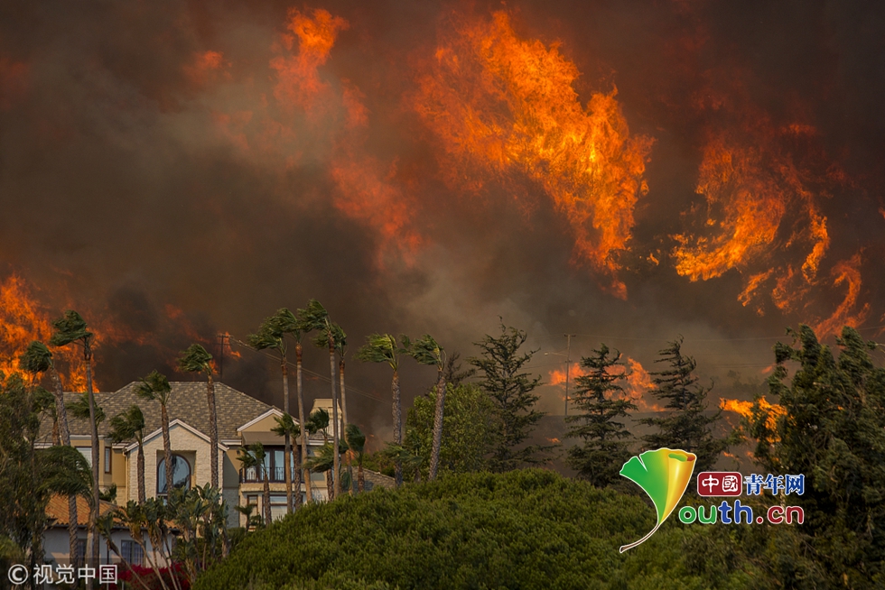 山火迅速蔓延至剛剛發(fā)生槍擊案的千橡樹市,并在9日翻過圣莫妮卡山,在強(qiáng)風(fēng)的助力下向海邊蔓延。