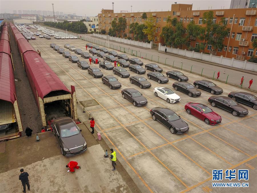 11月19日,在重慶團(tuán)結(jié)村站貨場(chǎng)內(nèi),首趟中歐班列商品車專用車運(yùn)輸國(guó)際班列在進(jìn)行卸貨作業(yè)(無(wú)人機(jī)拍攝)。 新華社記者 劉潺 攝