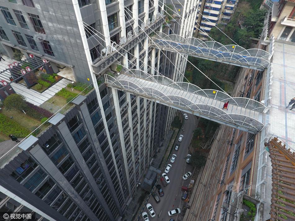 2017年3月16日,重慶,渝中區(qū)一棟大樓從22層架起兩座平行的天橋,連接對面的魁星樓廣場地面。圖片來源:視覺中國