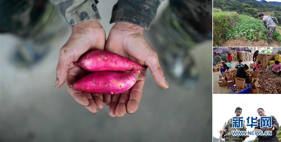 拼版照片:左圖為在大浪鎮(zhèn)桐里村,55歲的韋炳莊手捧剛剛收獲的高山紅薯;右上圖為韋炳莊在地里挖紅薯;右中圖為在縣城一個電商基地里,工作人員打包貧困戶種植的紅薯,準(zhǔn)備發(fā)往全國各地;右下圖為韋炳莊(左)在地里挖紅薯(照片均攝于11月18日)。今年,韋炳莊種植3畝高山紅薯,每畝年產(chǎn)3000多斤,他家已于2016年實現(xiàn)脫貧。 廣西融水苗族自治縣是國家扶貧工作重點縣,全縣“九山半水半分田”,生活生產(chǎn)環(huán)境較為惡劣,脫貧攻堅任務(wù)艱巨,目前還有7.68萬貧困人口。面對經(jīng)濟(jì)發(fā)展落后、貧困面廣且程度深的現(xiàn)狀,當(dāng)?shù)匕衙撠毠耘c創(chuàng)新產(chǎn)業(yè)扶持相結(jié)合,依托生態(tài)資源優(yōu)勢,實施“特色產(chǎn)業(yè)富民行動”,通過發(fā)展特色民族旅游、林下經(jīng)濟(jì)和特色養(yǎng)殖業(yè)等扶貧產(chǎn)業(yè),帶動貧困群眾依靠勤勞的雙手,拔窮根摘窮帽,實現(xiàn)脫貧致富。據(jù)了解,目前全縣貧困戶參與特色產(chǎn)業(yè)發(fā)展的有2.9萬戶,扶貧產(chǎn)業(yè)覆蓋率達(dá)95%。 新華社記者 黃孝邦 攝