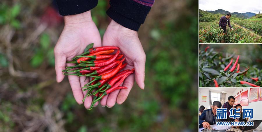 拼版照片:左圖為在大浪鎮(zhèn)大德村,龍德手捧剛剛收獲的辣椒;右上圖為龍德在摘辣椒;右中圖為合作社種植的辣椒;右下圖為龍德(中)在辦公室里工作(照片均攝于11月18日)。龍德是大德村的致富帶頭人,目前合作社種植有400多畝辣椒,帶動106戶貧困戶參與。 廣西融水苗族自治縣是國家扶貧工作重點縣,全縣“九山半水半分田”,生活生產(chǎn)環(huán)境較為惡劣,脫貧攻堅任務(wù)艱巨,目前還有7.68萬貧困人口。面對經(jīng)濟(jì)發(fā)展落后、貧困面廣且程度深的現(xiàn)狀,當(dāng)?shù)匕衙撠毠耘c創(chuàng)新產(chǎn)業(yè)扶持相結(jié)合,依托生態(tài)資源優(yōu)勢,實施“特色產(chǎn)業(yè)富民行動”,通過發(fā)展特色民族旅游、林下經(jīng)濟(jì)和特色養(yǎng)殖業(yè)等扶貧產(chǎn)業(yè),帶動貧困群眾依靠勤勞的雙手,拔窮根摘窮帽,實現(xiàn)脫貧致富。據(jù)了解,目前全縣貧困戶參與特色產(chǎn)業(yè)發(fā)展的有2.9萬戶,扶貧產(chǎn)業(yè)覆蓋率達(dá)95%。 新華社記者 黃孝邦 攝