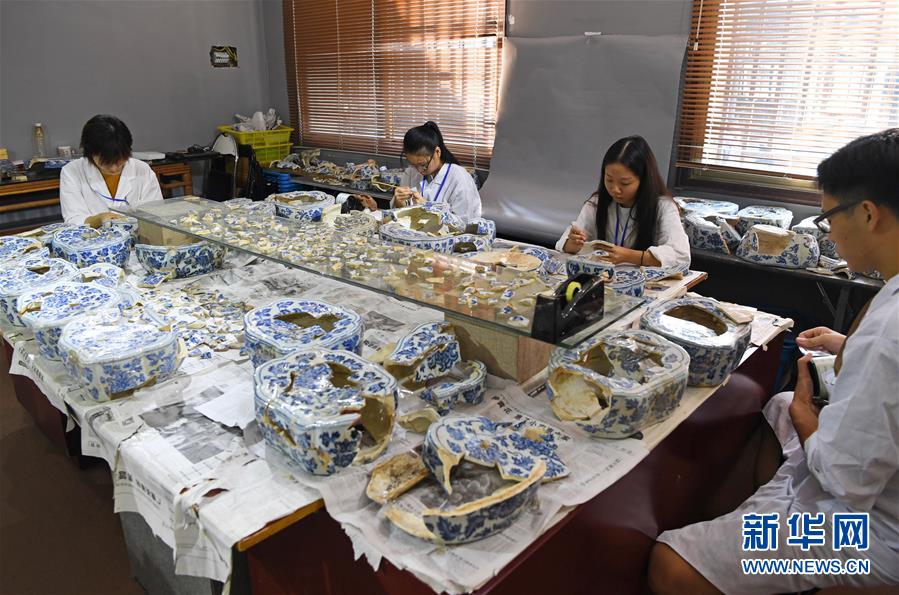 在江西景德鎮(zhèn)御窯廠遺址,工作人員正在修復(fù)明代瓷枕(9月20日攝)。 新華社記者 萬(wàn)象 攝
