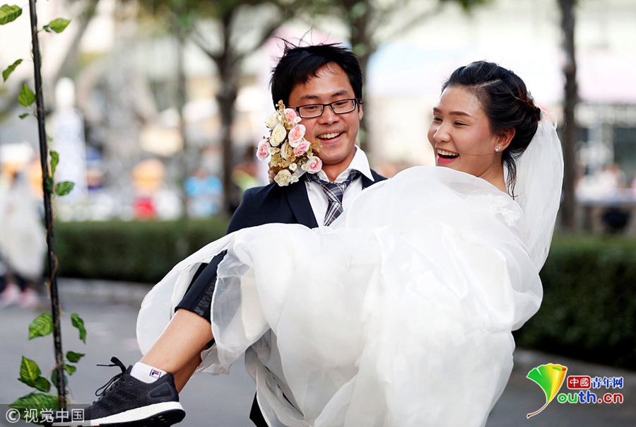 當?shù)貢r間2018年11月24日,泰國曼谷舉辦新娘賽跑活動,獲勝者將獲得婚禮的全額資助,眾多新娘在街頭提裙狂奔。圖為甜蜜合影。