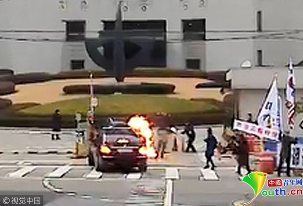 當(dāng)?shù)貢r(shí)間2018年11月27日,韓國(guó)首爾,27日上午9點(diǎn)10分,在首爾瑞草區(qū)的最高法院前面,一名74歲的示威男子向韓國(guó)最高法院院長(zhǎng)金明秀所乘的車輛投擲燃燒瓶。副駕駛一側(cè)的前輪和示威男子身上均起火,所幸被現(xiàn)場(chǎng)警察迅速撲滅,金明秀未受傷。當(dāng)時(shí),他正準(zhǔn)備去上班。