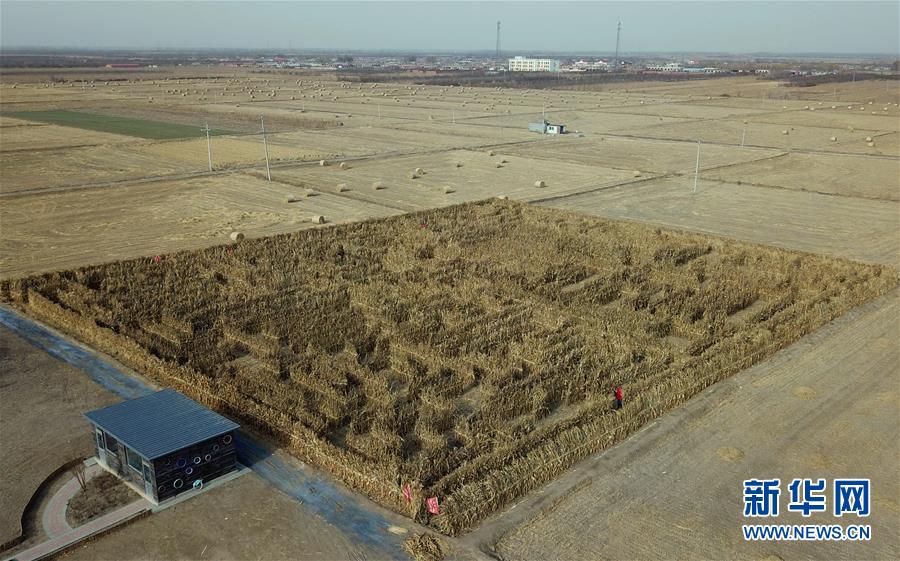 11月28日,游客在昌黎縣劉臺莊鎮(zhèn)白棗林村的玉米秸稈迷宮內游玩(無人機拍攝)。 新華社記者楊世堯攝