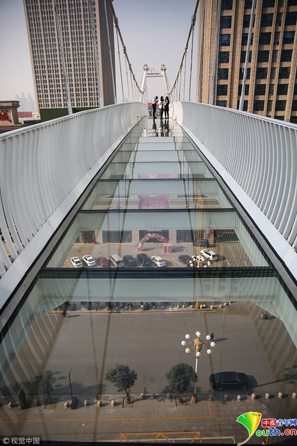 這座玻璃吊橋位于石家莊南二環(huán)附近,橋體橫跨塔通大街,長100米,高30米,。橋面由52塊特質(zhì)玻璃構(gòu)成,其中4塊為特效玻璃,游客腳踩上去就會(huì)發(fā)出玻璃破裂的聲音。