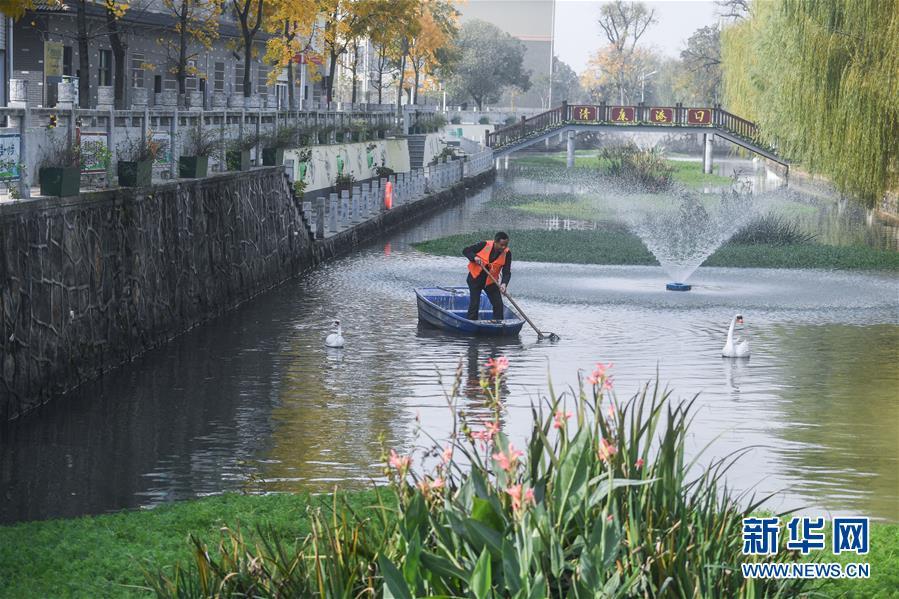11月28日,林城鎮(zhèn)北湯村河長(zhǎng)黃雙喜(右)在施家邊河打撈水面漂浮物。近年來(lái),北湯村全面推進(jìn)“五水共治”,停止河道內(nèi)的水產(chǎn)養(yǎng)殖,并進(jìn)行河道清淤,整治周邊環(huán)境,另外還結(jié)合北湯生態(tài)園旅游項(xiàng)目,發(fā)展旅游經(jīng)濟(jì),打造水上娛樂(lè)設(shè)施?,F(xiàn)在北湯村施家邊河道水質(zhì)清澈,環(huán)境秀美,每年為北湯村吸引游客18萬(wàn)人次。 新華社記者 徐昱 攝