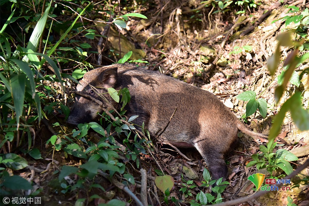 山豬個頭不大,身長1米左右,毛色呈深褐色。從體型判斷,這只山豬應該體重在35公斤左右,估計年齡只有1歲。