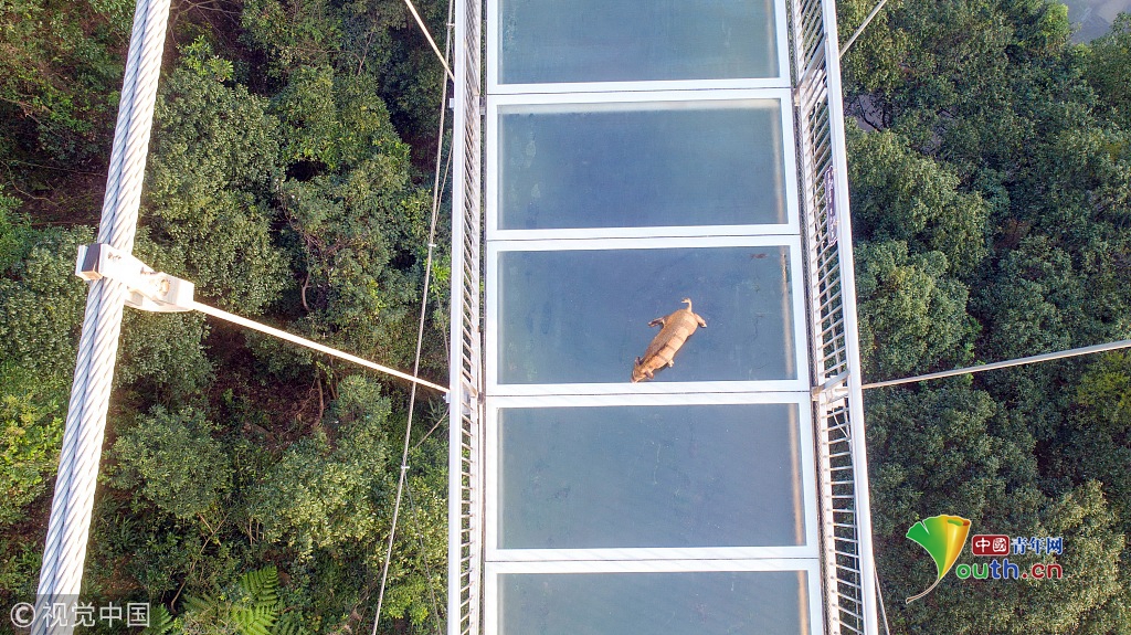 保安估計這只山豬是因為早上霧大誤闖入玻璃橋。估計是第一次上玻璃橋,不知道玻璃是何物,加上玻璃下面又是深不見底的大峽谷,山豬非常害怕,渾身發(fā)抖,趴在橋上不敢走動。加上玻璃橋上有霧水,山豬后腿不停打滑,更將山豬嚇得沒了主意。