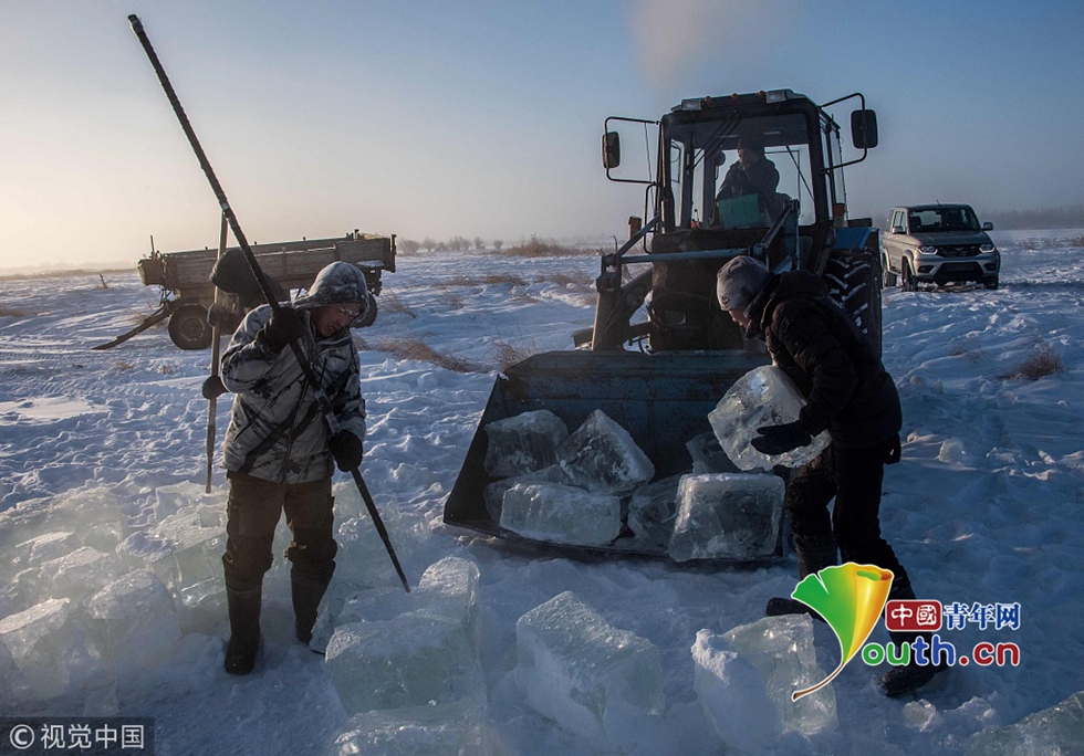 圖為村民將采集上來(lái)的冰塊裝車。