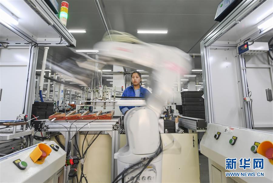11月29日,在位于福建省石獅市蚶江鎮(zhèn)的通達集團生產(chǎn)車間,工人在智能機械臂旁實時監(jiān)控一批小米手機殼的生產(chǎn)情況。 新華社記者 宋為偉 攝