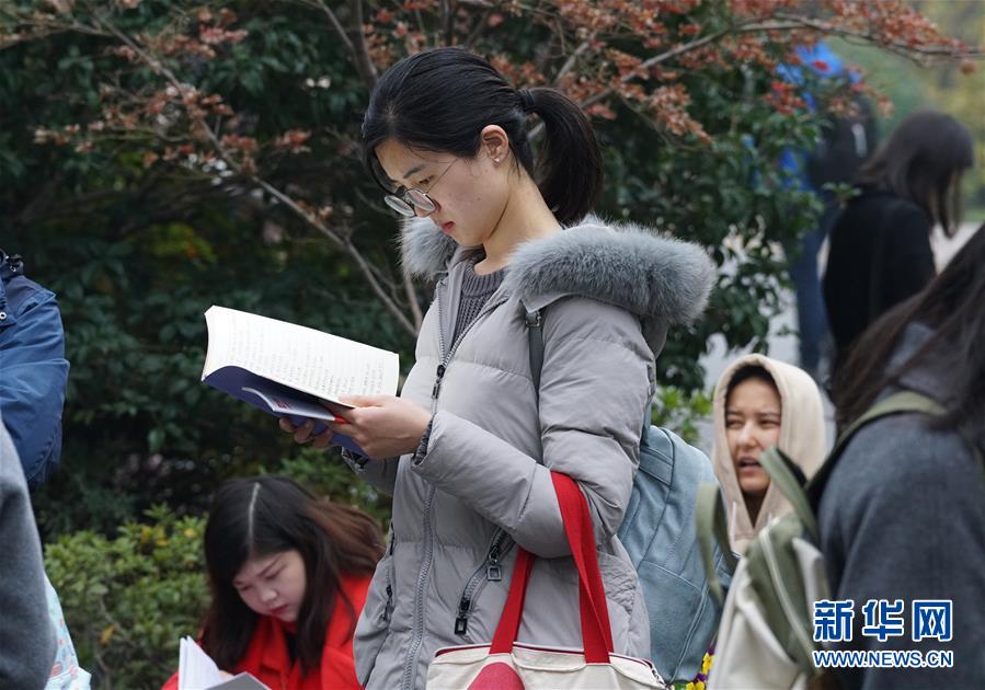 12月2日,在南京林業(yè)大學(xué)考點(diǎn),一名考生在等候進(jìn)場(chǎng)時(shí)復(fù)習(xí)。 新華社記者 孫參 攝