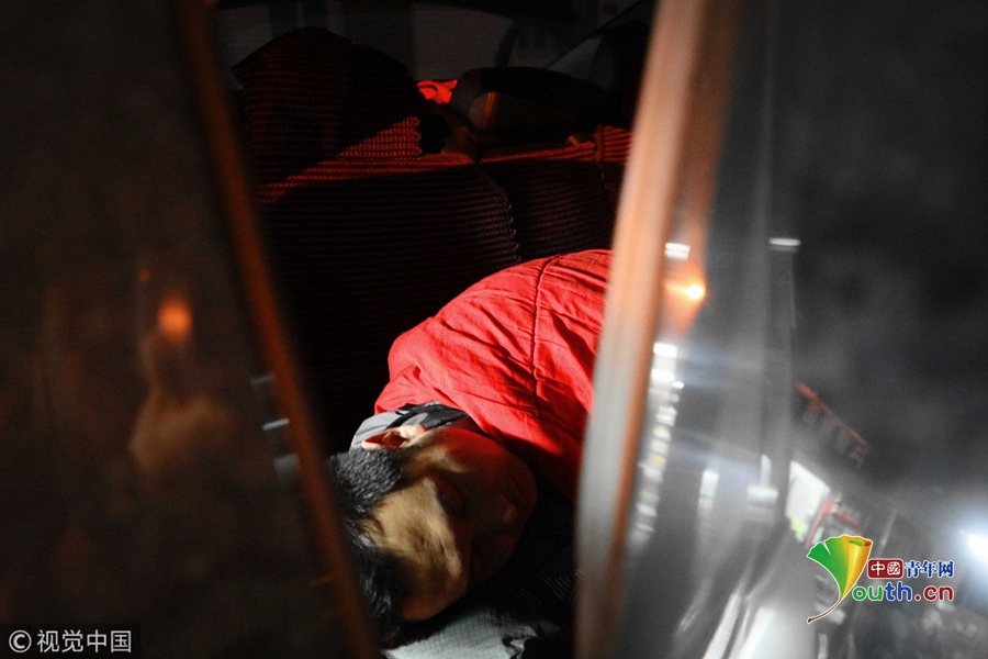 2018年11月17日,北京,由于醫(yī)院只允許一名家長陪護(hù),醫(yī)院門口的日租房又很貴,袁東方不舍得花錢,只好借住在病友的車內(nèi)。魏建順/視覺中國