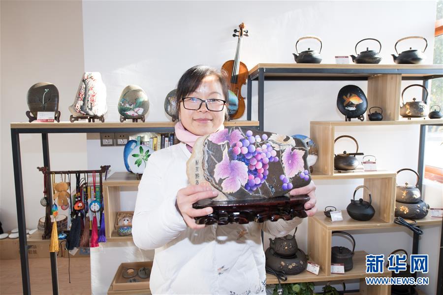 “農(nóng)民畫(huà)家”陳蘇蘭在開(kāi)設(shè)的工作室內(nèi)展示創(chuàng)作的石頭畫(huà)《下姜葡萄》(1月10日攝)。