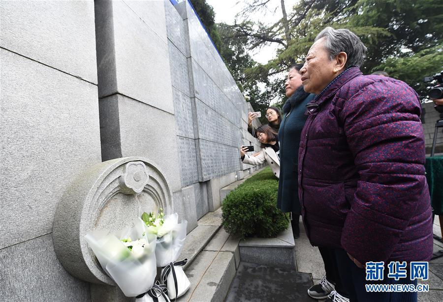 12月3日,南京大屠殺幸存者石秀英(右)率家屬在死難者名單墻前憑吊被侵華日軍殺害的親人。 當(dāng)日,在第五個(gè)南京大屠殺死難者國家公祭日到來之際,南京大屠殺死難者遺屬家祭活動在侵華日軍南京大屠殺遇難同胞紀(jì)念館正式啟動。首批前來開展家祭活動的南京大屠殺幸存者余昌祥、石秀英老人分別率家屬在紀(jì)念館內(nèi)的死難者名單墻前獻(xiàn)花、敬香、跪拜,并誦讀家信,表達(dá)對親人的哀思。 新華社記者 孫參 攝