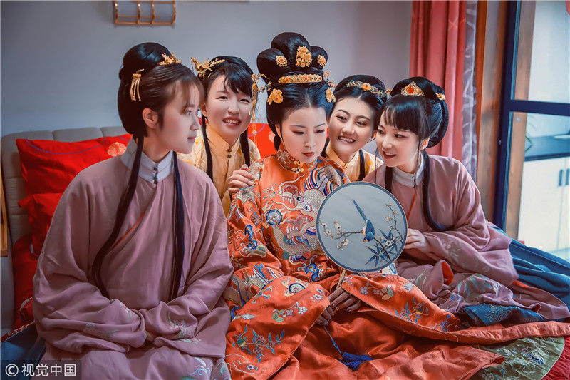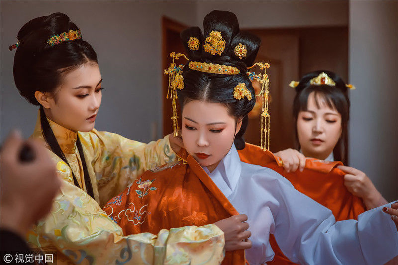 2018年11月18日,浙江嘉興。女孩黃聰今年30歲,是浙江省海寧市硤石人,是一位對漢文化情有獨(dú)鐘的個性女孩。對于這一次的漢婚大禮的每一個細(xì)節(jié),都非常仔細(xì)。小到發(fā)簪首飾,大到日常禮儀。說起為什么會舉辦這樣一場古風(fēng)婚禮,她說自己從2013年戀上漢服,就下了這個決定。