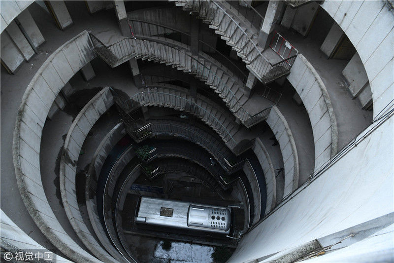 魔幻重慶再添新景觀 公交車(chē)穿8層空心圓筒樓