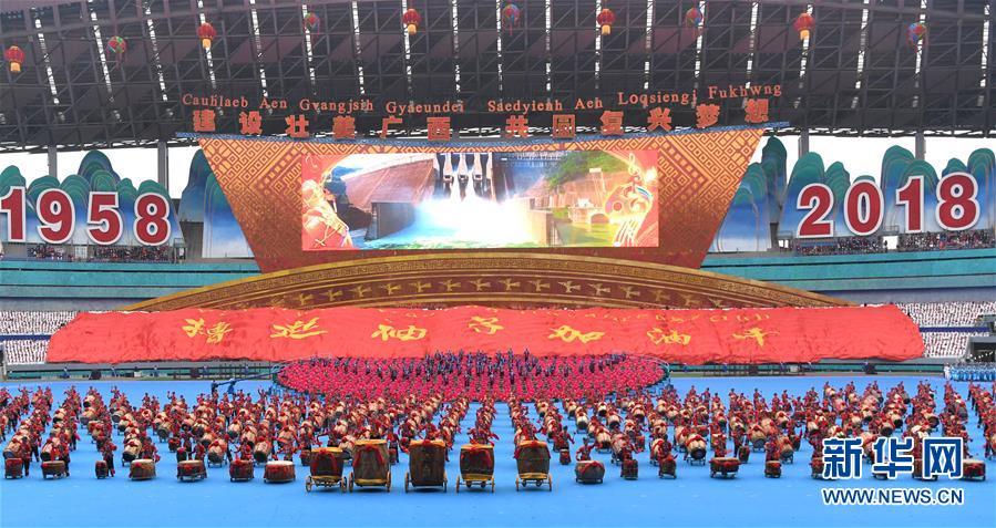 12月10日,廣西壯族自治區(qū)成立60周年慶祝大會(huì)在廣西體育中心隆重舉行。這是慶祝大會(huì)上的群眾文藝表演。 新華社記者 周華 攝