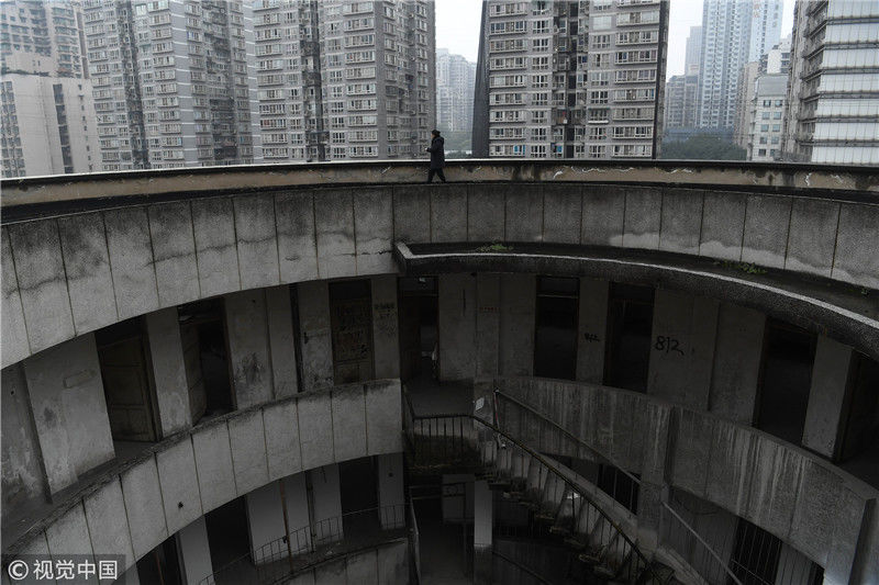 2018年12月6日,重慶江北紅旗河溝汽車站內(nèi),有一棟獨特的八層圓環(huán)狀建筑,底層每天有不少進出站的客車通行。據(jù)悉,這棟樓建于1990年,曾經(jīng)是車站旅館,如今一、二兩層用于車站辦公,其余樓層已廢棄。為確保安全,三層以上已經(jīng)被封鎖。圖為公交車穿過8層空心圓筒樓。徐勇/視覺中國