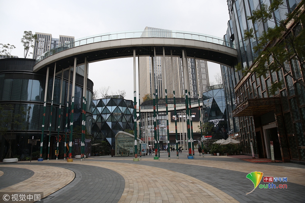 2017年3月16日,重慶,渝中區(qū)一棟大樓從22層架起兩座平行的天橋,連接對(duì)面的魁星樓廣場(chǎng)地面。圖片來(lái)源:視覺(jué)中國(guó) |