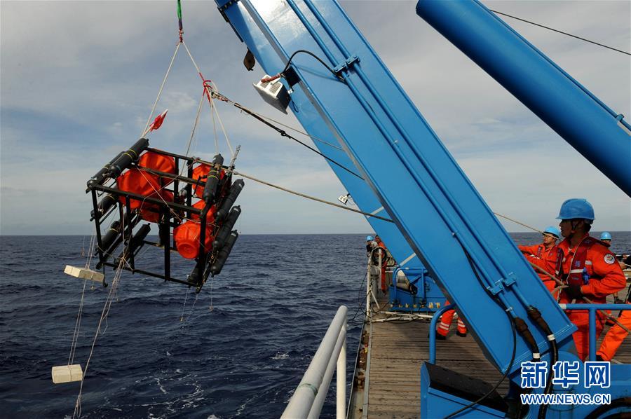 考察隊(duì)員將負(fù)責(zé)采集海水的“彩虹魚(yú)”第二代著陸器布放到海里(12月10日攝)。 由上海海洋大學(xué)和西湖大學(xué)聯(lián)合組成的“彩虹魚(yú)”科考團(tuán)隊(duì),12月11日在全球最深的海溝——馬里亞納海溝成功完成兩臺(tái)“彩虹魚(yú)”第二代著陸器的萬(wàn)米級(jí)海試,深度分別為10918米和10899米。 新華社記者 張建松 攝