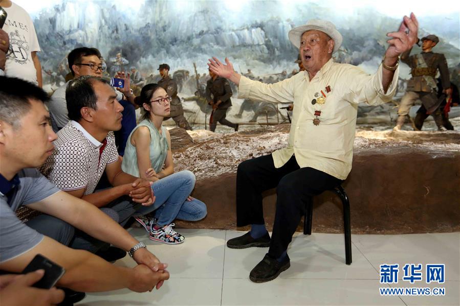 在乳山市馬石山十勇士紀(jì)念館,參加馬石山突圍戰(zhàn)的抗戰(zhàn)老兵趙金林給參觀者講述戰(zhàn)斗經(jīng)歷(2015年9月2日攝)。 新華社記者郭緒雷攝