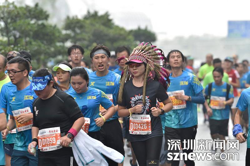 2018年12月16日,深圳國際馬拉松位于后海的折返點,一名選手頭戴特色頭飾,向終點沖刺。