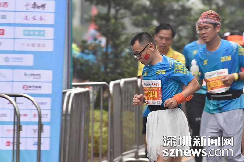 2018年12月16日,深圳國(guó)際馬拉松位于后海的折返點(diǎn),一名著女式短裙的選手正在向終點(diǎn)沖刺。