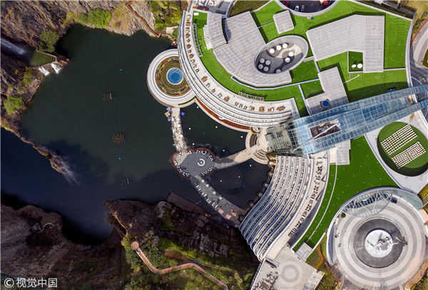 另外,大堂內(nèi)有一根動態(tài)水幕,自下而上直通屋頂,水幕是根據(jù)深坑的景色變化、巖層變化而安排的設(shè)計故事體驗(yàn)。