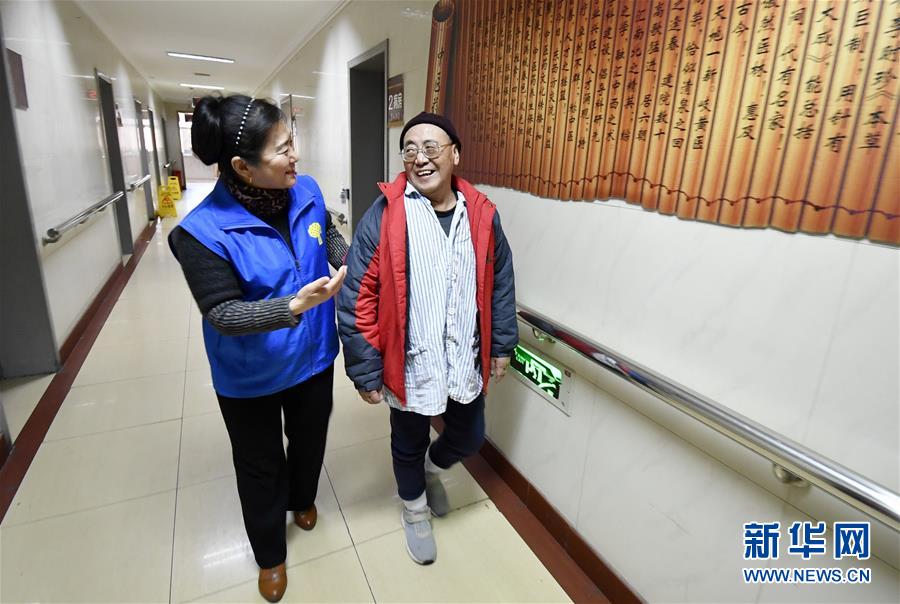 12月17日,豐臺區(qū)長辛店街道車輛廠社區(qū)養(yǎng)老服務(wù)驛站的員工陪同她們通過“連心通”救助的突發(fā)疾病獨(dú)居老人連鐵良(右)做康復(fù)。 新華社記者 李欣 攝