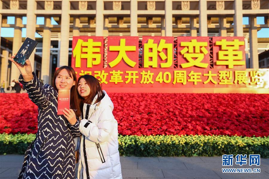 12月18日,參觀者在“偉大的變革——慶祝改革開放40周年大型展覽”外自拍留影。 截至當(dāng)日,在中國國家博物館舉行的“偉大的變革——慶祝改革開放40周年大型展覽”累計(jì)參觀人數(shù)突破160萬人次。 新華社記者 張玉薇 攝