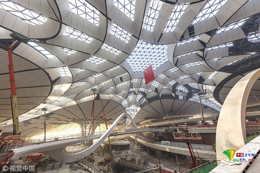 中國青年網(wǎng)北京12月20日電 2018年12月19日,北京大興國際機場航站樓的屋面已基本完工,一只金色“鳳凰”完整地出現(xiàn)在北京城南。航站樓的室內裝修在有條不紊的推進中。