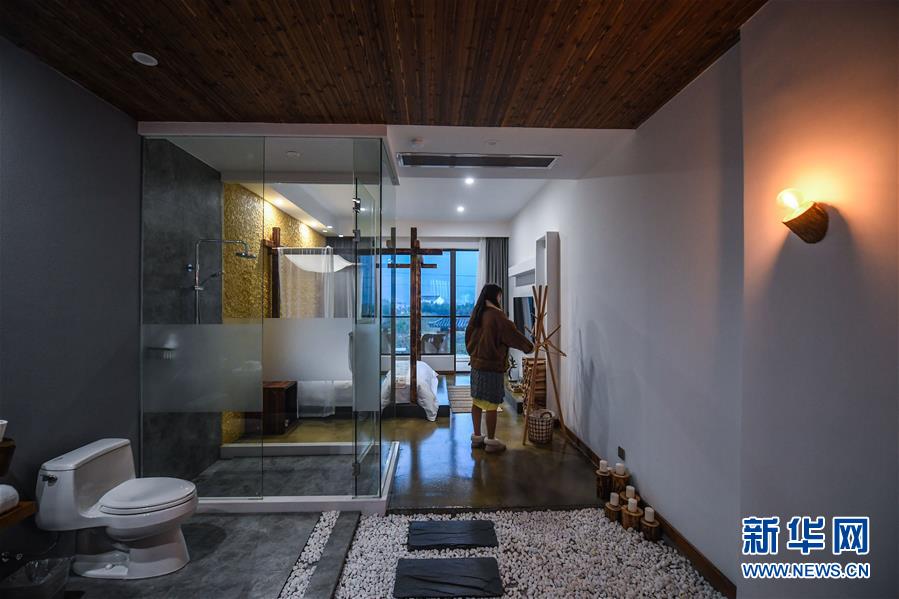 12月19日,章淑貞在民宿“初憶小院”房間內(nèi)整理內(nèi)飾。該民宿是河橋鎮(zhèn)“90后”女孩章淑貞開辦的,民宿融入了大量的現(xiàn)代建筑設(shè)計風(fēng)格,深受年輕人的喜愛。 新華社記者 徐昱 攝
